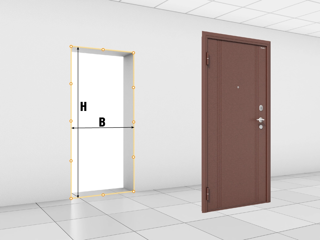 Замерьте высоту дверного проема (H) от выведенного, чистого пола. Для правильного замера необходимо знать точное положение нулевой отметки. Запишите минимальное значение.